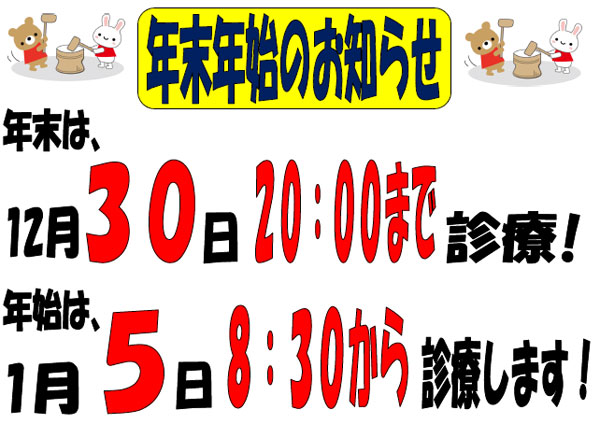 年末は、12月30日(金)の20:00まで診療します! 年始は、1月5日(木)の8:30から診療します! ※12月31日~1月4日まで休診させて頂きます。※
